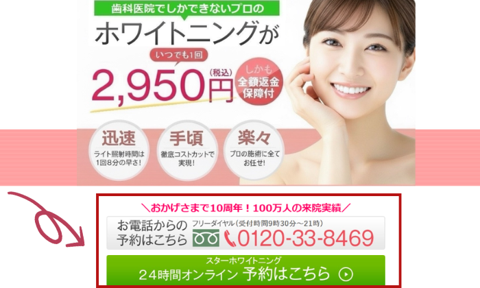 スターホワイトニングの場合、最安値として都度払い1回(8分×1)が¥2,950円になります。